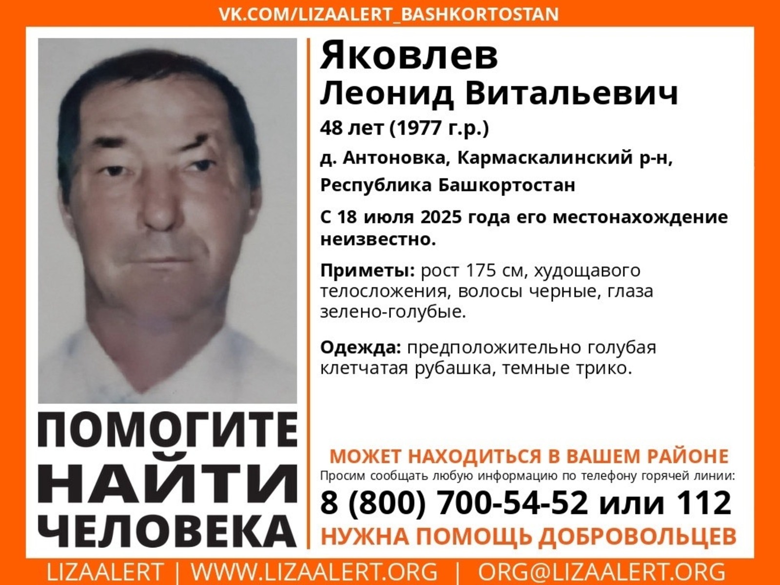 Поиски жителя деревни Антоновки в Кармаскалинском районе Леонида Яковлева ведутся с середины июля. По данным отряда «Лиза Алерт РБ», мужчина мог быть одет в голубую клетчатую рубашку и темное трико.