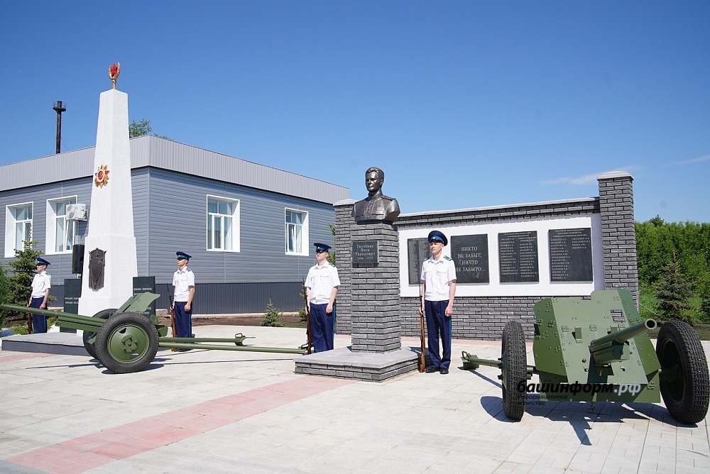 В центре мемориала – бюст Героя Советского Союза, капитана Якова Ткаченко. Уроженец Стерлитамакского района, он отличился во время наступательной операции советских войск в Восточной Пруссии весной 1945 года. После Великой Отечественной войны трудился в Свердловской области на металлургическом заводе и в научно-исследовательском горном институте.