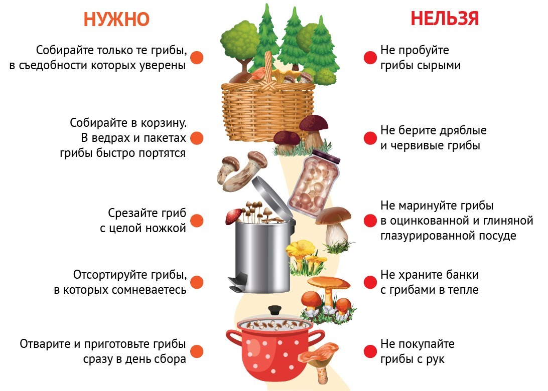 В управлении Роспотребнадзора по Башкирии пояснили «Башинформу», что все принесённые домой грибы в тот же день нужно перебрать, отсортировать по видам и вновь тщательно пересмотреть. Все червивые, перезревшие, пластинчатые грибы, грибы без ножек, дряблые, а также несъедобные и ядовитые необходимо выкинуть. Их нужно обязательно подвергнуть кулинарной обработке в день сбора, каждый вид грибов готовится отдельно.