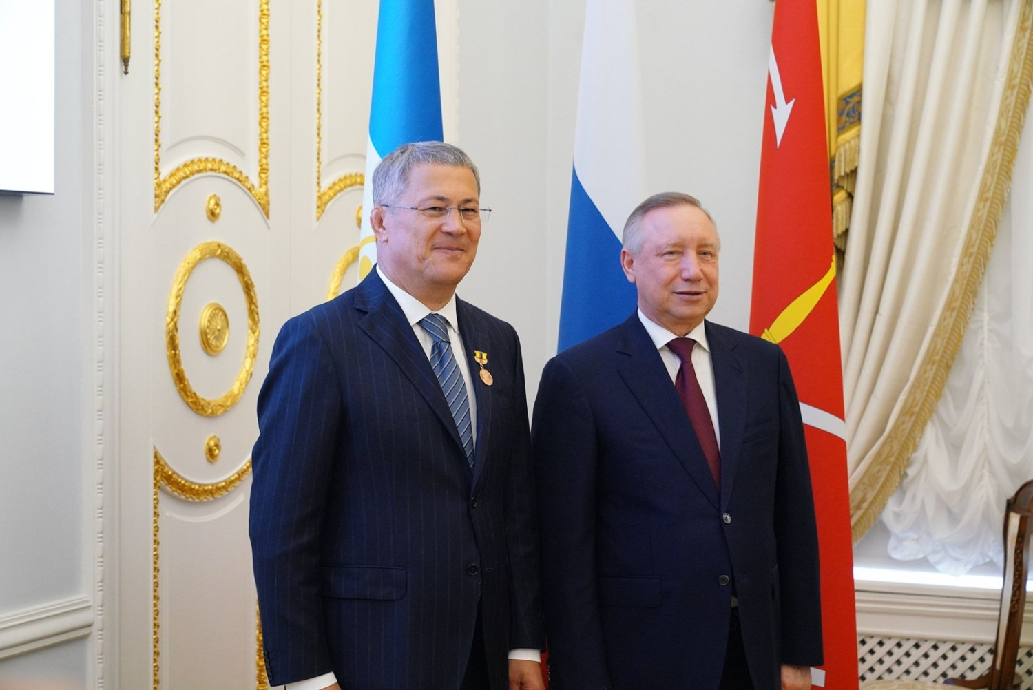 Губернатор Санкт-Петербурга также вручил Главе Башкортостана памятный знак «350 лет Петру Великому».
