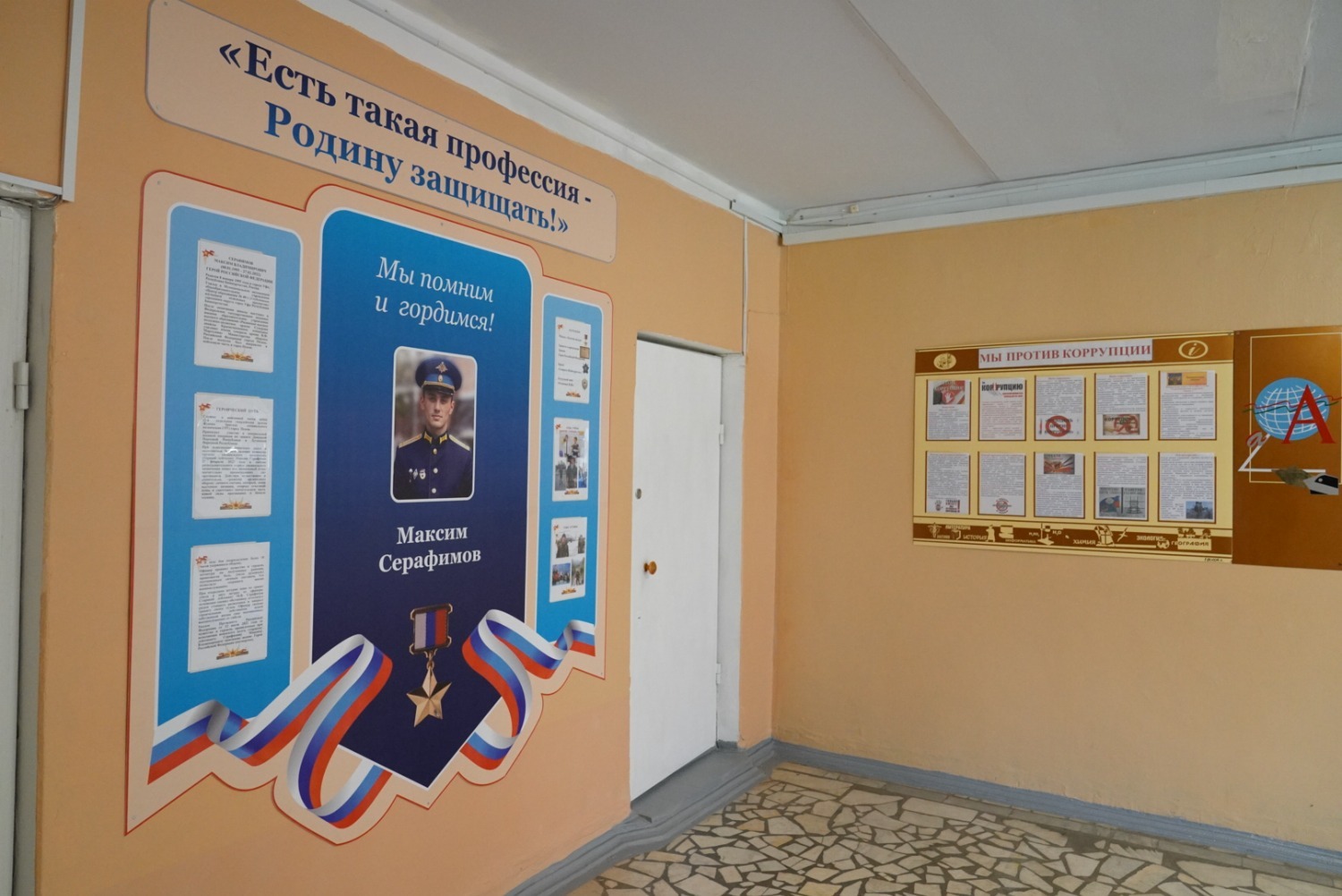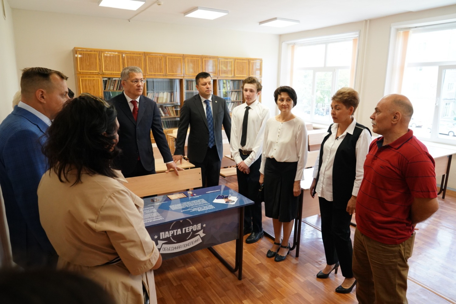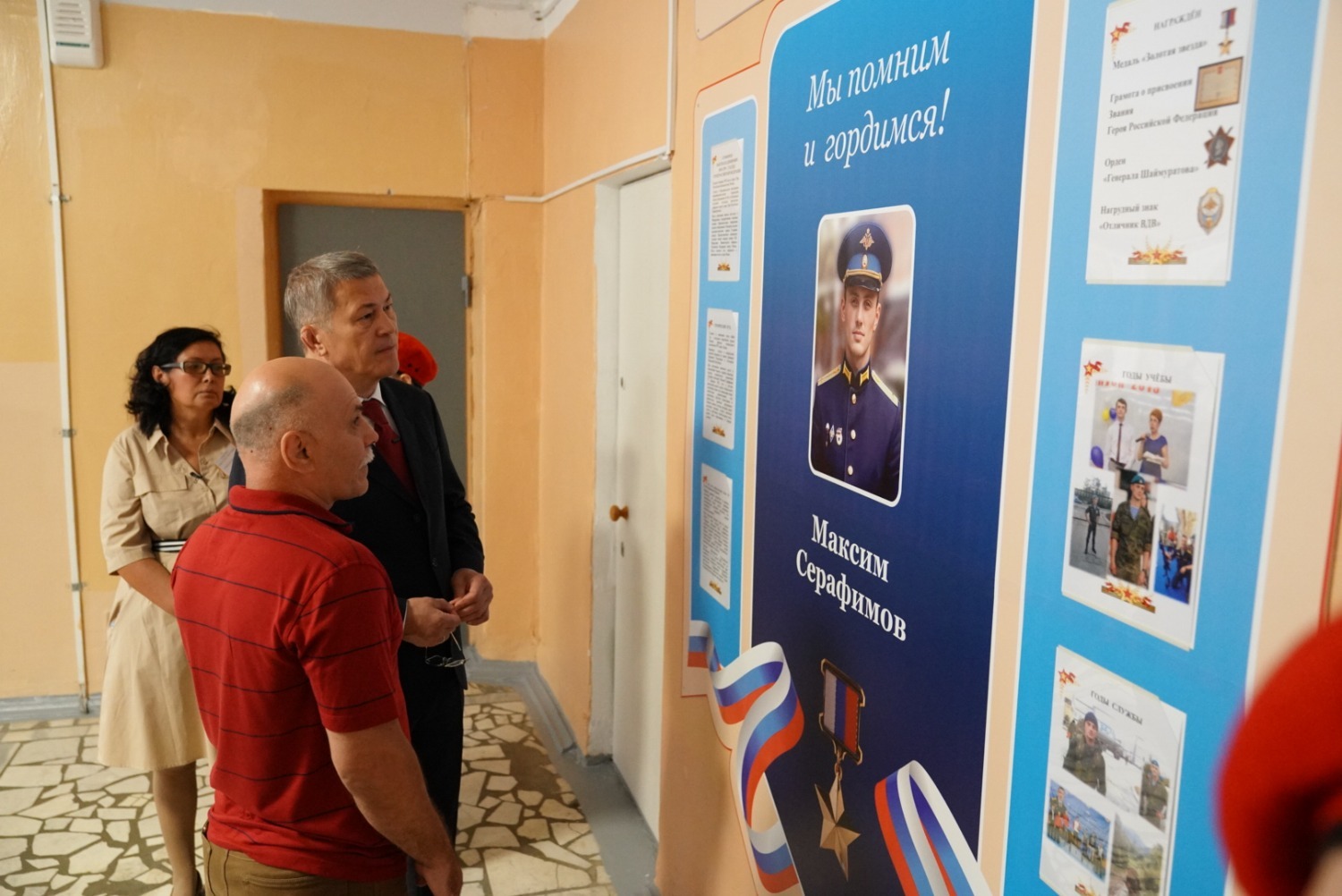Глава Башкирии побывал в классе, в котором стоит парта, за которой сидел герой, в фойе школы он осмотрел стенд, посвященный Максиму Серафимову, пообщался с его родителями, побывал в школьном музее геологии и столовой.