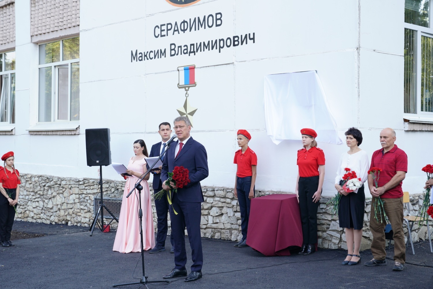 «Сегодня мы собрались здесь, чтобы отдать дань памяти и уважения замечательному человеку, офицеру Максиму Серафимову, окончившему эту школу в 2013 году, показавшему всем нам пример мужества. Мы благодарим родителей Максима Владимировича, кланяемся им, воспитавшим такого замечательного человека. Я твердо обещаю, что его подвиг и он сам не будут забыты. С сегодняшнего дня ваша школа носит имя Максима Серафимова. Это большая честь для учащихся и большая ответственность. Мы также приняли решение присвоить имя Максима Серафимова военно-патриотическому парку «Патриот», где будем проводить много мероприятий в память о Герое. Вечная ему слава, вечная память! Вечная память всем героям, которые погибли и которые защищают нашу Родину!» - подчеркнул Радий Хабиров.