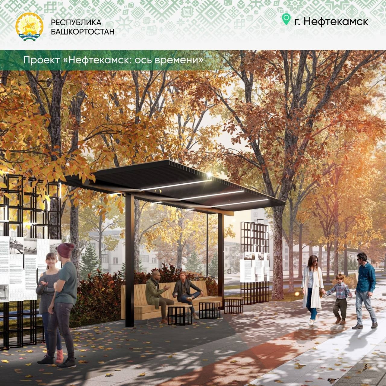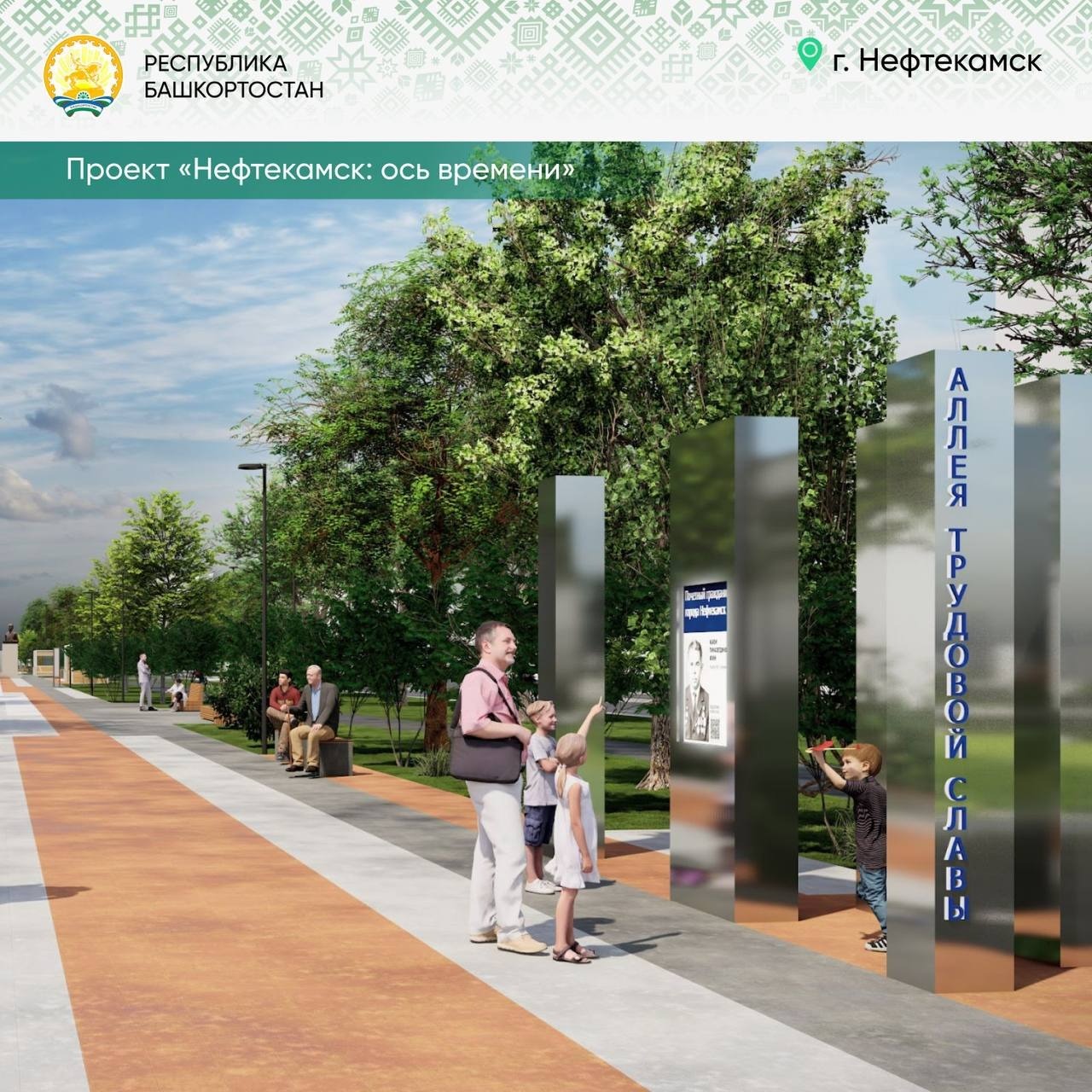 В рамках проекта «Нефтекамск: ось времени» предлагается благоустройство центральной городской площади, аллеи по ул. Ленина и прилегающей территории. Аллея интерпретирована как своеобразная «ось времени», на которой отразятся важные события истории города. Ось начинается от стелы, которая станет новым символом и акцентом со стороны въезда в центр Нефтекамска, и приводит к центральной городской площади. Аллею Трудовой славы, где расположены стенды с почетными горожанами, предлагается переформатировать: устаревшие стенды актуализировать, сделать их интерактивными и интересными для горожан.