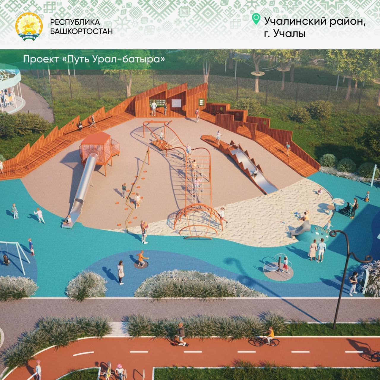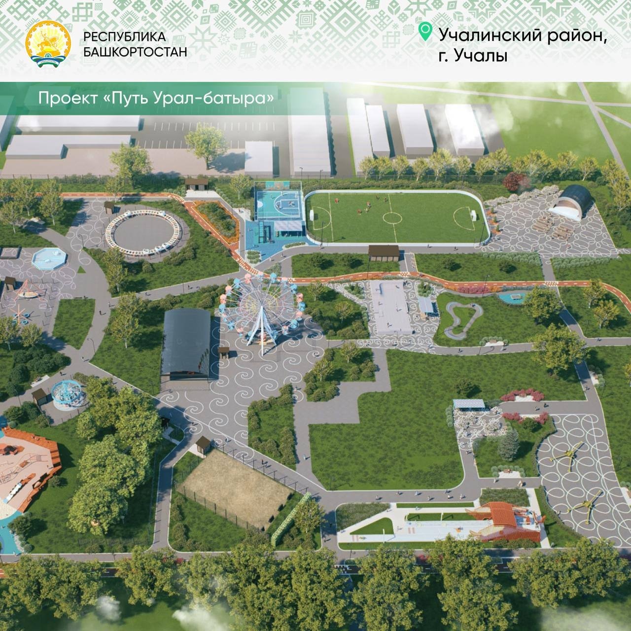 Реализация проекта «Путь Урал-батыра» подразумевает несколько этапов благоустройства территории парка культуры и отдыха в Учалах. На первом этапе благоустроят северную часть парка, где сконцентрированы основные функциональные зоны и объекты, которые находятся в устаревшем состоянии. Здесь много пустующих участков, нет озеленения. В парке обновится событийная зона, которую дополнят спортивные площадки, полностью преобразится детская игровая площадка. В основу концепции благоустройства лег эпос «Урал-батыр». Путь Урал-батыра выражен в образах основных функциональных зон парка, описывающих подвиги легендарных героев.