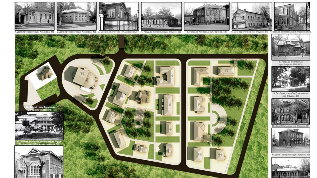 В первой части запланировано возведение 15-20 домов. Они представляют собой памятники архитектуры нашего города. Часть из них – сохранившиеся до настоящего времени ветхие строения, которые на данный момент разобраны и будут воссоздаваться вновь на территории музея. Наибольшую историческую ценность имеют утраченные на сегодня памятники архитектуры: летняя дача Зайковых, Видинеевский летний театр и другие. Их будут возводить по сохранившимся чертежам и фотографиям.