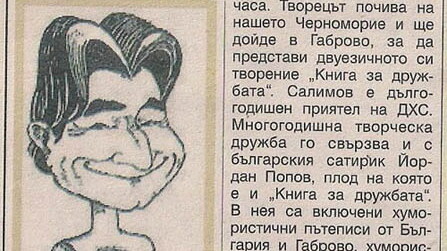 Об этой и о других не менее интересных встречах с видными болгарскими деятелями, такими, как бывший директор Дома юмора и сатиры Стефан Фыртунов, бывший главный редактор еженедельника «Стършел» Христо Пелитев, рассказал Марсель Салимов на своем творческом вечере. Смешные юморески на болгарском прозвучали в исполнении актера Габровского театра Светослава Славчева, сам автор прочитал свои произведения на русском, болгарском и на башкирском языках. Отвечая на многочисленные вопросы болгарских друзей, он рассказал о Башкортостане, о его людях, о культурных и литературных событиях в республике и стране.