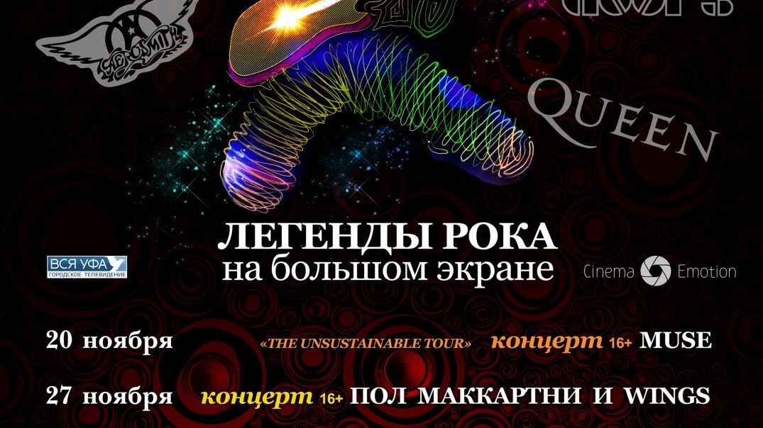 Уфимцы смогут увидеть в кино лучшие рок-концерты прошлого и настоящего: с 20 ноября по 18 декабря в прокате кинотеатра «Родина» - фильмы проекта «Легенды рока на большом экране». Программа включает запись концерта группы «Doors» 1968 года на стадионе «Hollywood Bowl»; фильм об американском туре 1976 года группы «Wings», созданной Полом Маккартни; выступление «Queen» в Будапеште в 1986 году; фильм «Rock For The Rising Sun», собравший лучшие фрагменты концертов «Aerosmith», и июльский концерт 2013 года группы «Muse». Записи восстановлены в цифровом формате.
