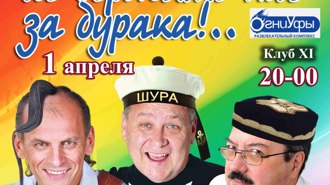 В уфимском развлекательном комплексе «Огни Уфы» 1 апреля состоится вечер смеха. В шоу «Не держите нас за дурака» участвуют пародист, лауреат международного фестиваля пародий «Большая разница» Александр Чистяков, сатирик Айрат Еникеев, бард Александр Лынник.