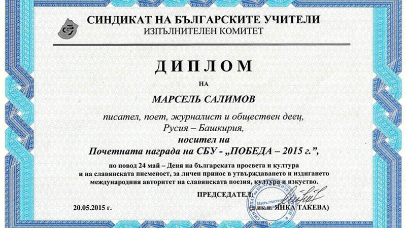 За личный вклад в развитие и повышение международного престижа славянской поэзии, искусства и культуры Марсель Салимов и украинская поэтесса Тетяна Дзюба были удостоены Почетной награды Профсоюза болгарских учителей «Победа - 2015 год».