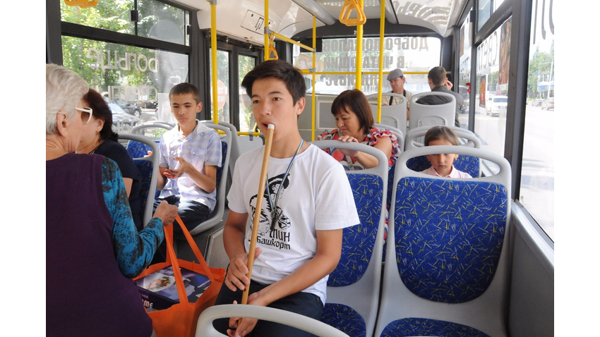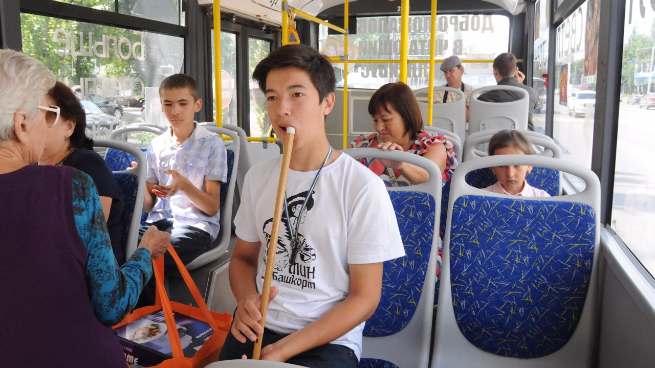 Пассажиров маршрута «Башдрамтеатр» - «Колхозный рынок» развлекали юные таланты - кураисты, певцы из Уфимской городской башкирской гимназии №20 имени Фатимы Мустафиной. Азамат Зайнетдинов играл на курае и кубызе, Ахсан Каекбердин пел песни и показывал пародии. В мероприятии приняли участие детские писатели Фарзана Губайдуллина, Альфия Асадуллина и Рашида Бик.