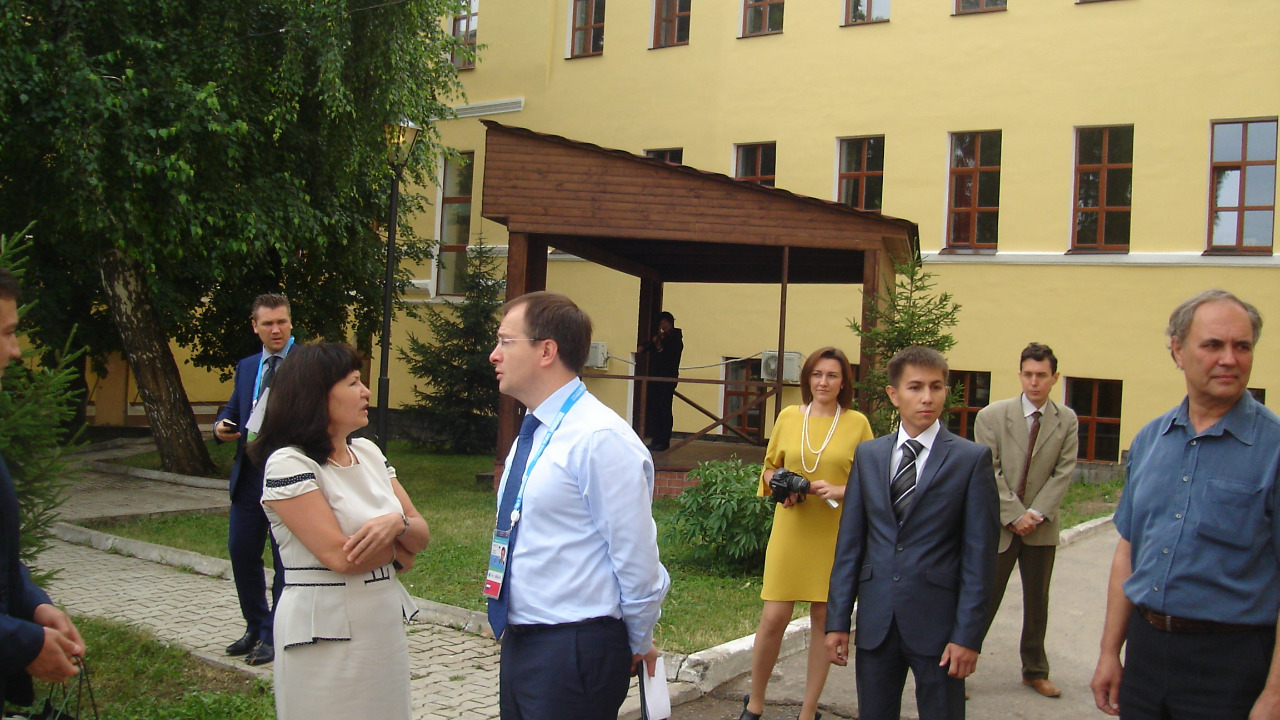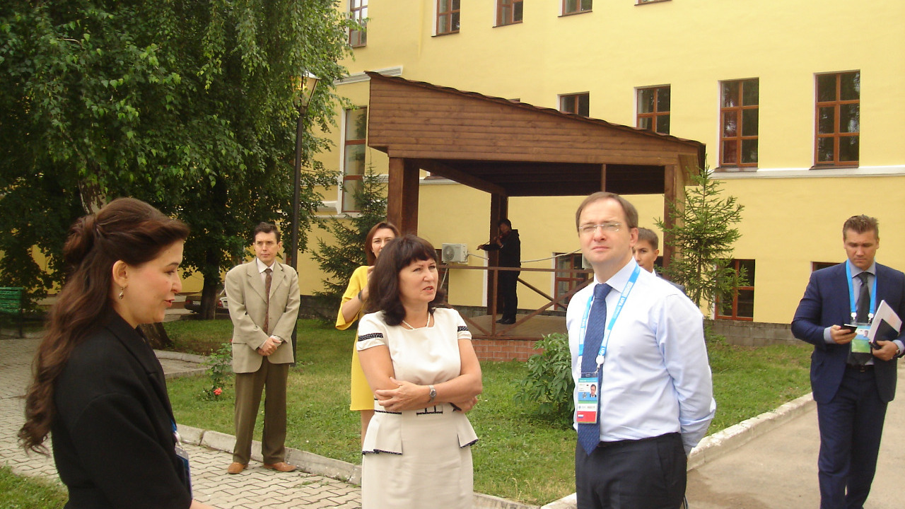 УФА, 8 июл 2015. /ИА «Башинформ», Лейла Аралбаева/. Сегодня, 8 июля, в рамках визита в столицу Башкортостана министр культуры России Владимир Мединский посетил Уфимскую государственную академию искусств имени Загира Исмагилова. Глава ведомства осмотрел здание после проведенного здесь ремонта фасадов. Также Владимиру Мединскому показали установленную во дворе основного корпуса академии летнюю сцену, предназначенную для концертов под открытым небом. Главу российского Министерства культуры сопровождали министр культуры республики Амина Шафикова и ректор УГАИ Амина Асфандьярова.