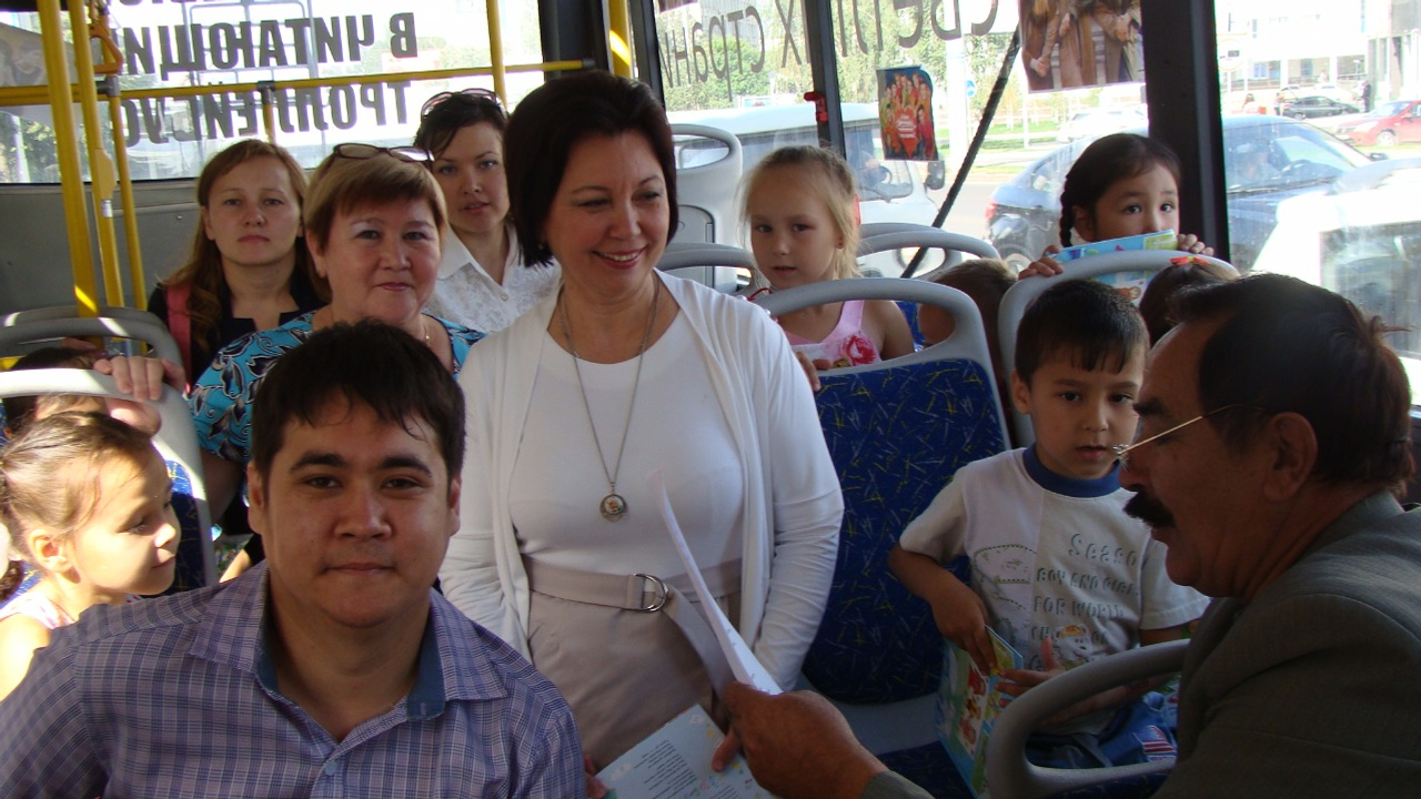Как только главный редактор журнала «Акбузат» Тамара Юлдашева пояснила детям, что такое Год литературы, на остановке в троллейбус вошел - совершенно случайно! - народный поэт Башкортостана Кадим Аралбай. По просьбе пассажиров он прочитал детям свое стихотворение «Башкортостан - страна белых юрт». Полюбился детям герой и автор рубрики «Небылицы» в журнале «Акбузат», артист Башкирской филармонии и писатель-юморист Юнир Салаватов. На его вопрос: «Кто из вас хочет стать генералом?» поднялся лес рук. «А майором?» «А солдатом?» Оказалось, мальчикам больше всего хочется стать солдатами. Они долго не отпускали юмориста. Поэтессы Гульназ Кутуева, Минигуль Тайсина, ответственный секретарь журнала Айнар Байбулатов, редактор Зубайда Исламова были в центре внимания детей и других пассажиров. Стихи, загадки, ответы на занимательные вопросы, песни под баян в руках ведущего - «Читающий троллейбус» от всего этого веселого представления ехал и как будто «улыбался», рассказали сотрудники журнала «Акбузат».