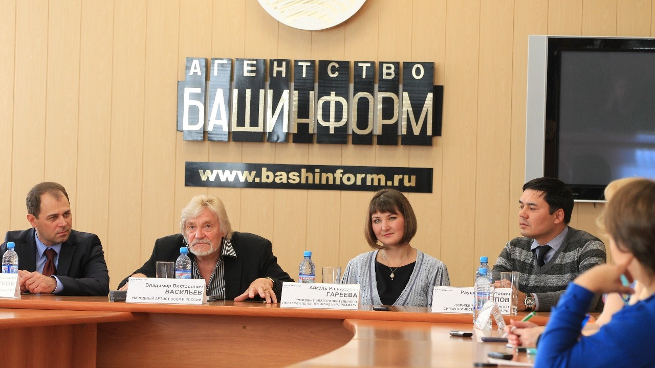 УФА, 21 сен 2015. /ИА «Башинформ», Лейла Аралбаева/. В Уфе 22 сентября будет представлена новая, девятая глава благотворительного проекта «Детский альбом». Программа «Волшебный мир балета» объединит музыку, слово и хореографию. В качестве чтеца на проект вновь приглашен легендарный артист балета и хореограф, народный артист СССР и России, лауреат Ленинской и двух Государственных премий РФ Владимир Васильев. Об особенностях и сюрпризах предстоящей программы в конференц-зале агентства «Башинформ» рассказали его организаторы — сам знаменитый артист, президент фонда «Мархамат» Айгуль Гареева, главный дирижер НСО РБ, художественный руководитель проекта Раушан Якупов и исполнительный директор Банка ПТБ Альберт Алимбеков.
