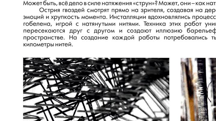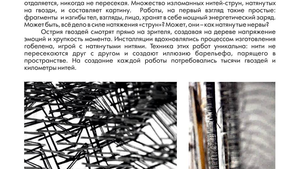 «Тонкая гладкая нить натянута, словно струна, почти до звона. Встречаясь со строгостью металла, она сгибается, ломается, с силой обнимает острые гвозди. Совсем близко проходит следующая нить, то приближается почти до слияния, то отдаляется, никогда не пересекаясь. Множество изломанных нитей-струн, натянутых на гвозди, и составляет картину. Работы, на первый взгляд такие простые: фрагменты и изгибы тел, взгляды, лица, хранят в себе мощный энергетический заряд. Может быть, все дело в силе натяжения «струн»? Может, они - как натянутые нервы?» — говорит о своих работах автор.