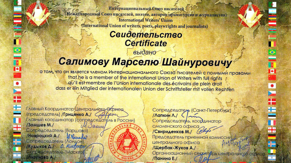 Международное правление Интернационального сообщества писателей и журналистов выдало Марселю Салимову сертификат «За заслуги в литературе» о том, что он является членом Интернационального союза писателей с полными правами.