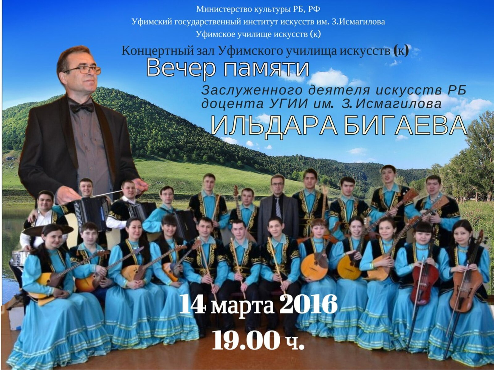 Ильдар Ахтямович Бигаев — известный педагог, заслуженный деятель искусств РБ, доцент кафедры традиционного музыкального исполнительства Уфимского государственного института искусств, художественный руководитель и дирижер оркестра башкирских народных инструментов факультета башкирской музыки УГИИ.