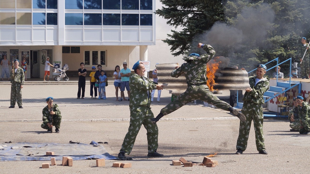 К курсантам присоединились и те, кто служил в ВДВ в разные годы. Они разбивали стеклянные предметы, забивали гвозди руками и проходили сквозь огонь под аплодисменты восторженных зрителей. В общий круг всех собравшихся объединила традиционная песня всех десантников «Расплескалась синева».