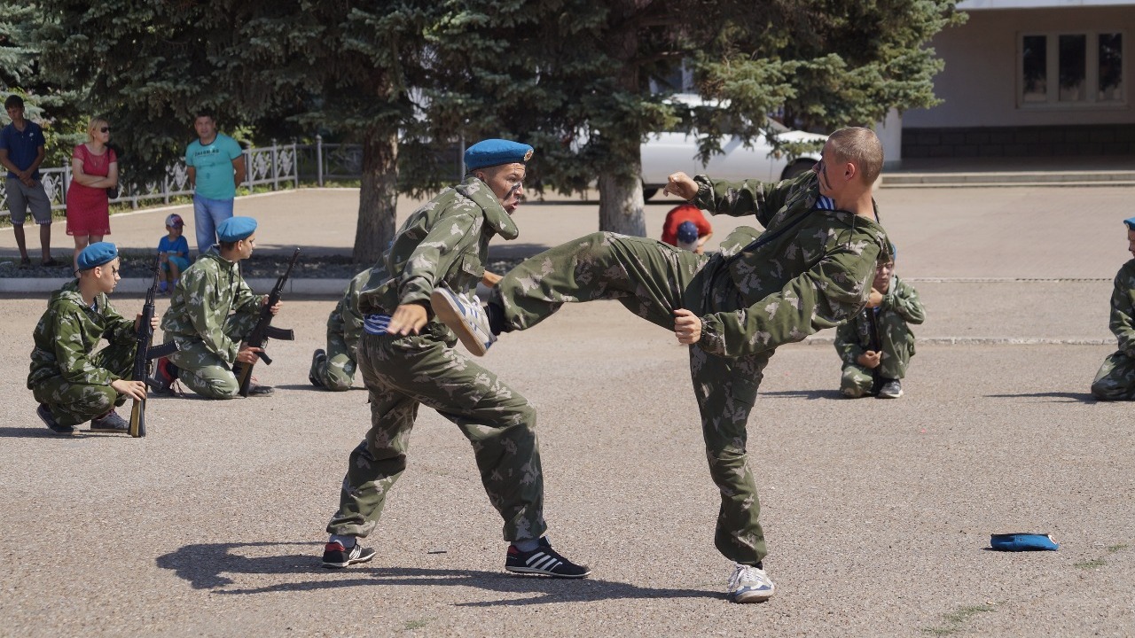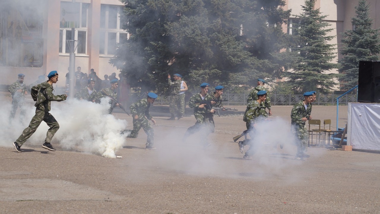 На центральной площади курсанты военно-патриотического клуба «Купол» продемонстрировали показательные выступления с применением автоматов Калашникова и дымовых шашек, умело показывали приемы рукопашного боя.