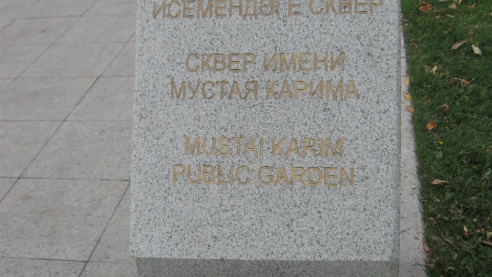 УФА, 30 сен 2016. /ИА «Башинформ», Людмила Кузьмина/. Оформление сквера имени Мустая Карима в Уфе приобрело завершающие черты. С двух сторон у входа в сквер установлены одинаковые гранитные тумбы, на которых высечены слова «Сквер имени Мустая Карима» на трех языках: башкирском, русском и английском. На самом памятнике народному поэту появились надписи золотыми буквами «Мустаю Кариму - народ Башкортостана» на двух языках - башкирском и русском. Кроме того, на постаменте из гранита размещены мемориальные таблички с информацией о Мустае Кариме, авторах памятника и времени его открытия: «Мустай Карим (Каримов Мустафа Сафич) (1919 – 2005); Народный поэт Башкортостана; Почетный гражданин города Уфы; Герой Социалистического Труда; Лауреат Ленинской и Государственной премий СССР; Памятник открыт 10 октября 2013 года; Скульптор – народный художник России А.Н.Ковальчук; Архитектор - С.З. Илембетов».