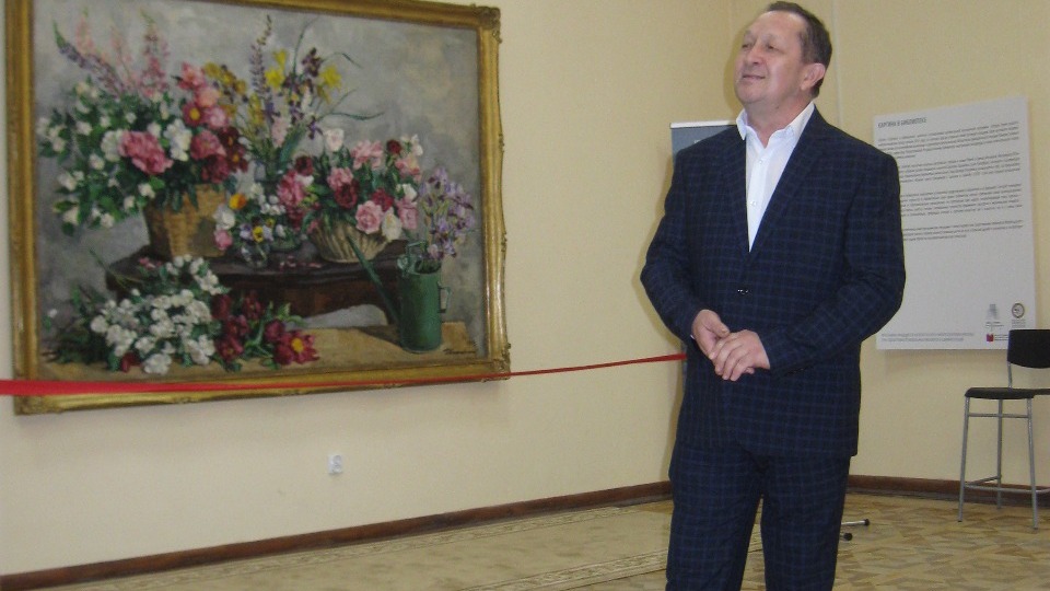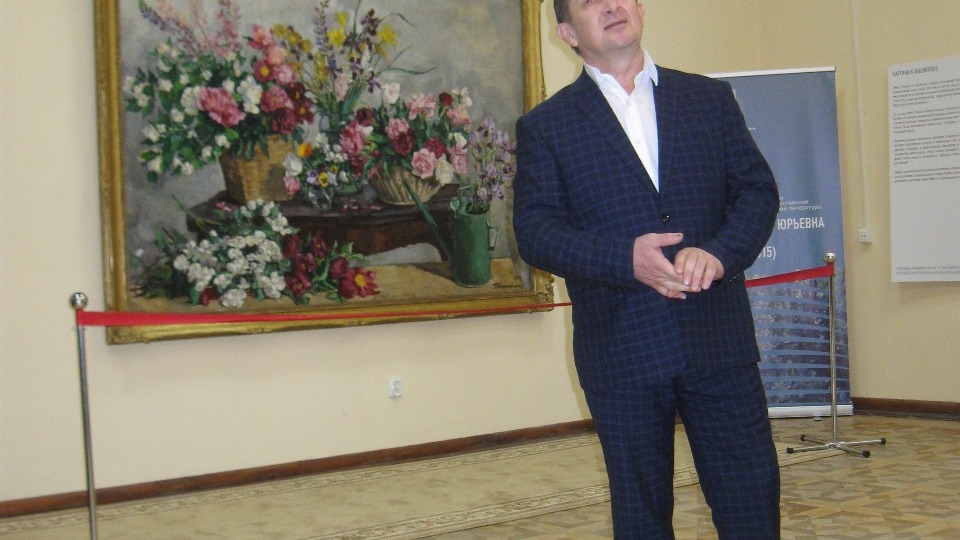Встреча в музыкальной гостиной проходила на фоне картины художника Петра Кончаловского «Четыре букета на столе и лейка» - огромного полотна, занимающего почти всю стену. Этот монументальный натюрморт экспонируется в Уфе в рамках проекта «Картина в библиотеке», осуществляемого под эгидой Музея русского экспрессионизма.