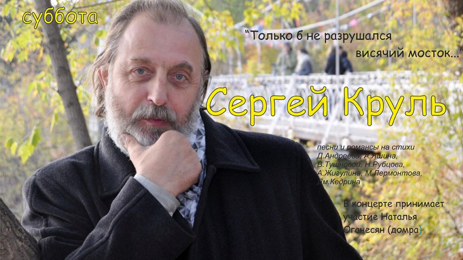 УФА, 29 ноя 2016. /ИА «Башинформ», Алим Фаизов/. Известный бард и музыкант Сергей Круль продолжает серию концертных выступлений в Уфе. «Только б не разрушался висячий мосток…» - так автор назвал музыкальный вечер романса, который состоится в субботу, 3 декабря, в Доме-музее им. С.Т. Аксакова. Голубой зал музея, строгий и благородный, как нельзя более подходит для исполнения романсов. Вниманию зрителей будут предложены сочинения на стихи Даниила Андреева, Николая Рубцова, Анатолия Жигулина, Дмитрия Кедрина, Николая Заболоцкого, Марии Аввакумовой, Ларисы Миллер. В концерте примет участие студентка УГИИ Наталья Оганесян, уже не раз очаровывавшая уфимцев своей игрой на домре.