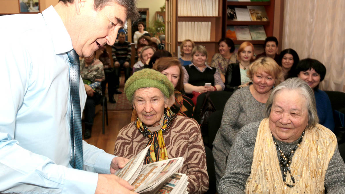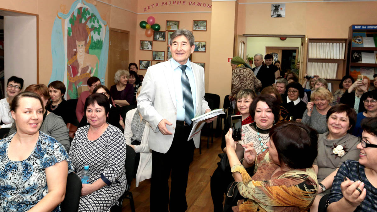 Одна из присутствующих в зале читательниц в знак благодарности и признательности за творчество своего любимого писателя, с листа его книги «О времена…», изданной шрифтом Брайля, прочла стихотворение на башкирском языке.