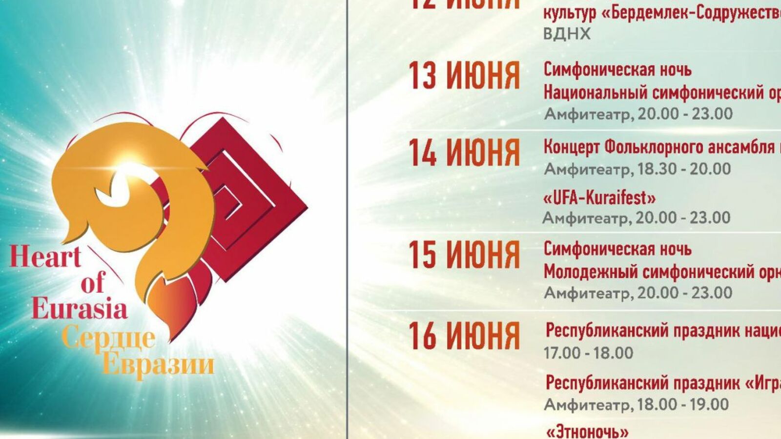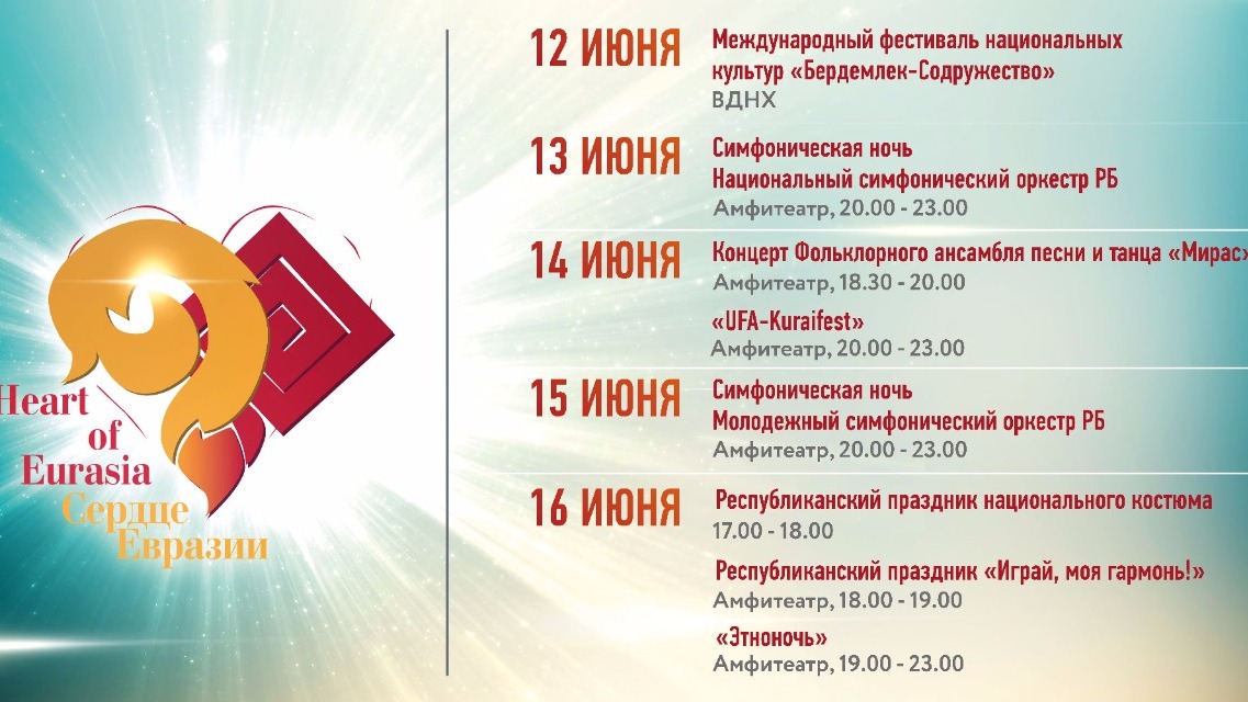 Завершится Международный фестиваль искусств «Сердце Евразии» 16 июня. В 17.00 на площади перед БАДТ им. М. Гафури стартует республиканский праздник национального костюма народов Башкортостана. Республиканский «Праздник тальянки» соберет профессиональных и самодеятельных артистов.