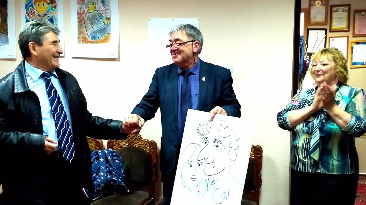 Альберт Кудаяров провел с детьми мастер-класс. Он подарил Марселю Салимову его дружеский шарж. В ответ писатель-юморист нарисовал шарж художника и вручил ему.