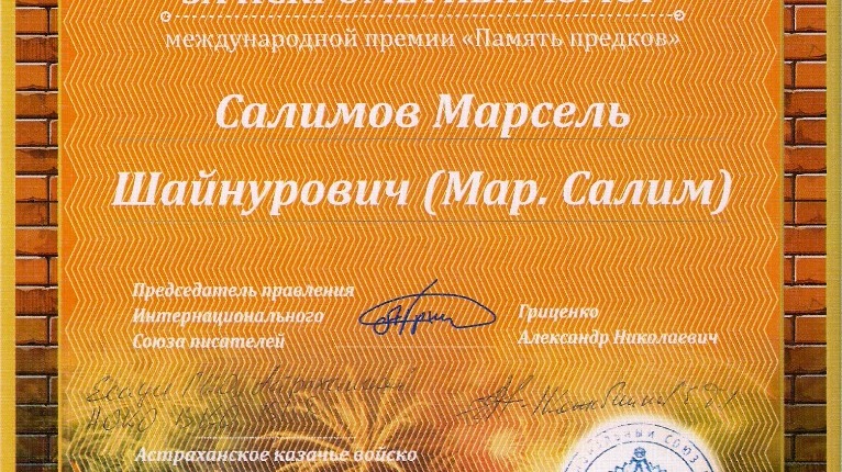 По результатам своих выступлений на литературных мероприятиях известный башкирский юморист стал лауреатом международного фестиваля. За участие в поэтическом конкурсе «Память предков» Марсель Салимов также был награжден специальным призом «За искрометный юмор».