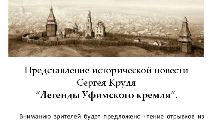 УФА, 5 окт 2017. /ИА «Башинформ», Алим Фаизов/. В День республики, 11 октября, в Уфимской художественной галерее (ул. Революционная, 34) состоится презентация исторической повести Сергея Круля «Легенды Уфимского кремля». Повесть вышла два года назад и уже полюбилась уфимскому читателю, получила хорошие отзывы критиков.