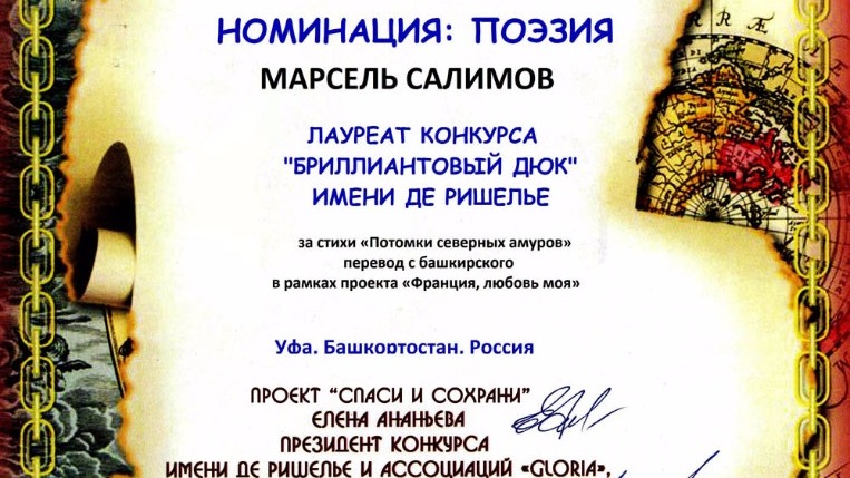В номинации «Поэзия» проекта «Франция, любовь моя» Марсель Салимов признан лауреатом конкурса «Бриллиантовый Дюк» имени де Ришелье за стихи «Потомки северных амуров», переведенные на французский язык.