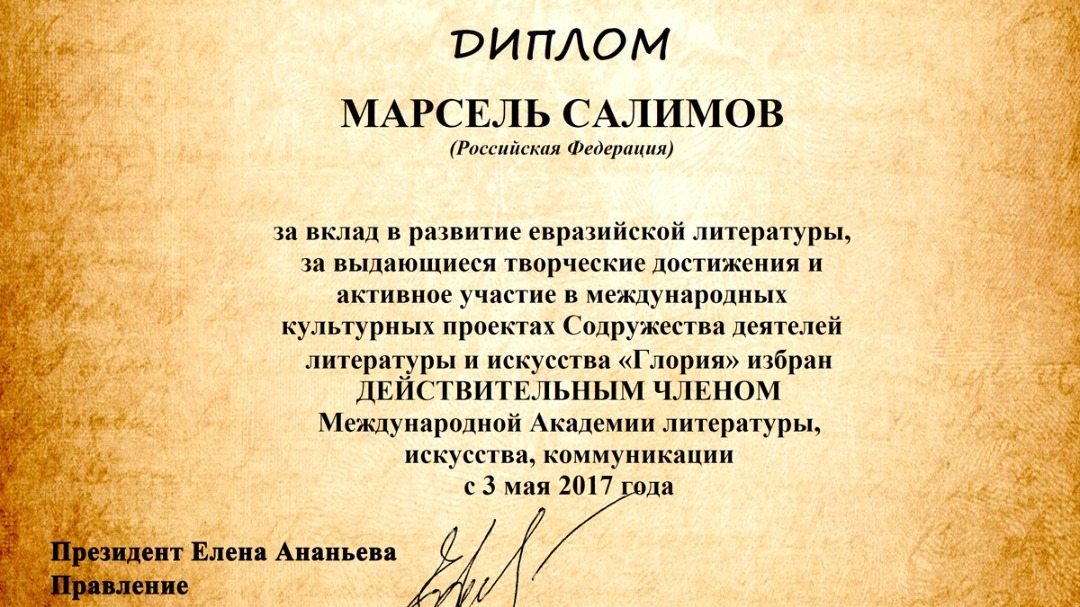 Марселю Салимову вручили сертификат об избрании действительным членом Международной Академии литературы, искусства, коммуникации (Германия) за вклад в развитие евразийской литературы, за выдающиеся творческие достижения и активное участие в международных культурных проектах Содружества деятелей литературы и искусства «Глория».