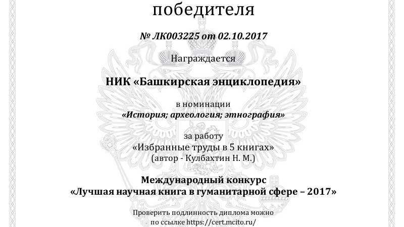 УФА, 10 ноя 2017. /ИА «Башинформ», Алим Фаизов/. В городе Кирове подведены итоги Международного конкурса «Лучшая научная книга в гуманитарной сфере» за 2017 год. По его результатам книга профессора, заслуженного деятеля наук Башкортостана Назира Кулбахтина «Избранные труды в 5 книгах» признана победителем в номинации «История; археология; этнография». Дипломами награждены автор и научно-издательский комплекс «Башкирская энциклопедия», где была издана книга. В издание вошли пять наиболее значимых монографий Назира Кулбахтина, посвященных различным аспектам истории башкирского народа и Башкортостана в 16-17 веках.