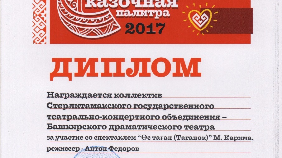 УФА, 5 дек 2017. /ИА «Башинформ», Альфия Аглиуллина/. Театральная труппа Стерлитамакского государственного театрально-концертного объединения стала победителем II Межрегионального фестиваля национальных молодежных театров и ТЮЗов «Сказочная палитра» в Чебоксарах. Коллектив из Башкортостана признан лучшим в номинации «Лучший спектакль для юного зрителя (режиссура)».
