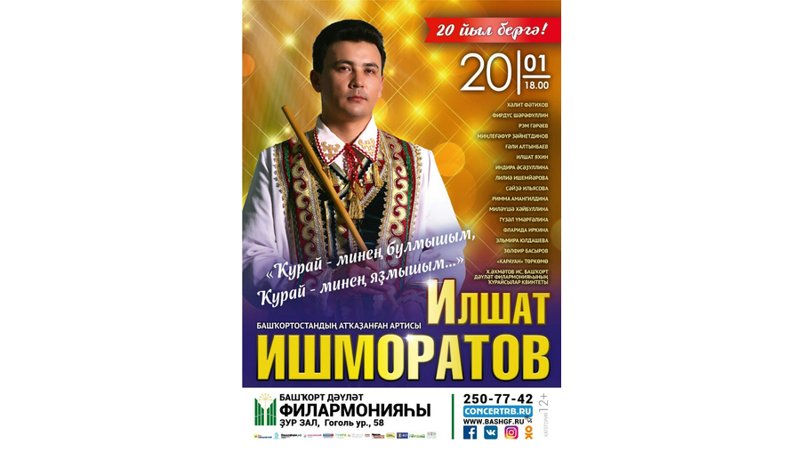 УФА, 10 янв 2018. /ИА «Башинформ», Лейла Аралбаева/. В Уфе кураист, заслуженный артист Башкортостана, лауреат российских и республиканских конкурсов Ильшат Ишмуратов приглашает на 20-летие творческой деятельности. Концерт музыканта и его друзей состоится 20 января в 18.00 в Башкирской государственной филармонии.