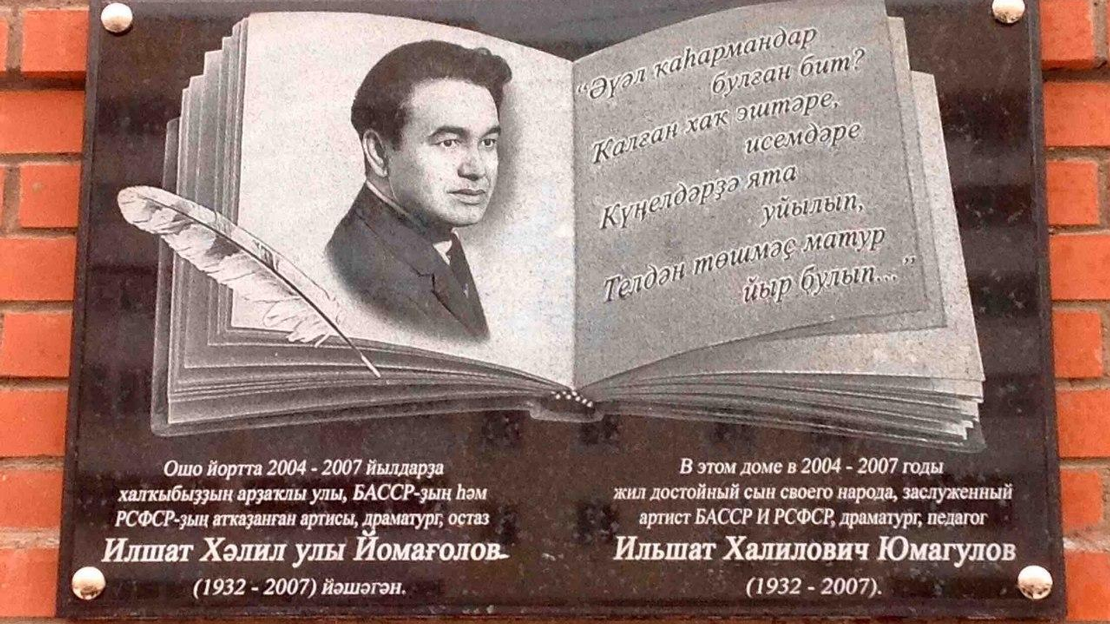 Памятную доску украшает книга с портретом Ильшата Юмагулова и его собственными поэтическими строками философского содержания. Идея композиции принадлежит супруге актера, актрисе Башдрамтеатра Рамзии Хисамовой.