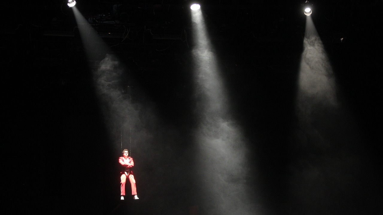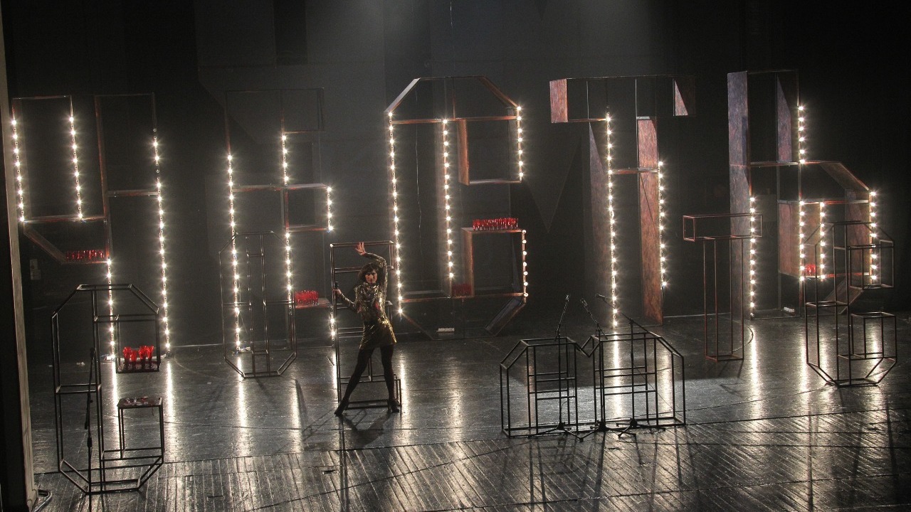 Эмоции героев показываются на экране крупным планом. В спектакле присутствует и сам режиссер, выступая с текстами мойр - богинь судьбы.
