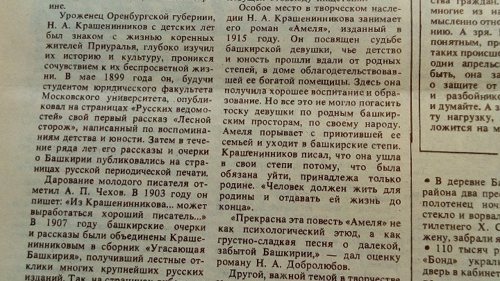 УФА, 13 июл 2018. /ИА «Башинформ», Алим Фаизов/. Приволье лесов и степей, древние уральские горы, небесной чистоты реки и озера, целебный климат, свободолюбивый башкирский народ с его историей - такой предстает Башкирия в произведениях замечательного русского писателя Николая Александровича Крашенинникова (1878-1941). О том, как много сделал он для того, чтобы привлечь внимание общественности к судьбе «тихо угасающего» башкирского народа рассказала газета «Башкирия» в мае 1993 года. Агентство «Башинформ» продолжает знакомить читателей с материалами из Национального архива РБ.