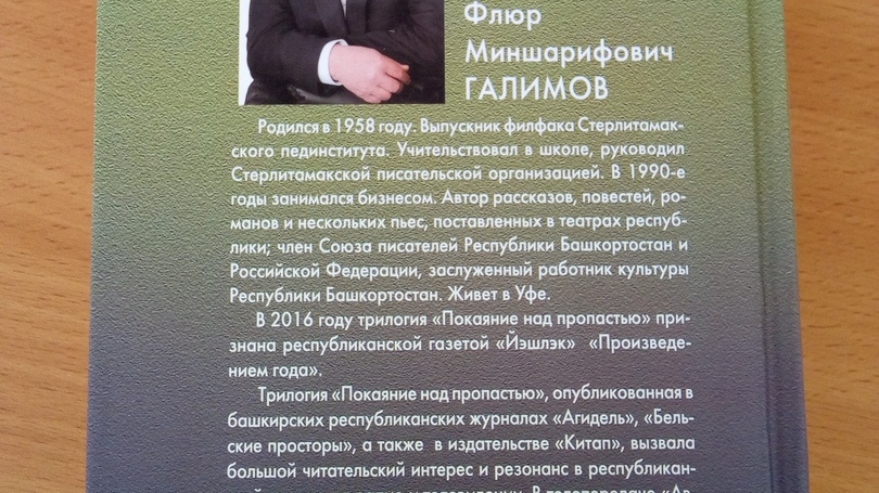 УФА, 27 авг 2018. /ИА «Башинформ», Лейла Аралбаева/.В московском издательстве «Художественная литература» опубликована трилогия башкирского писателя Флюра Галимова «Покаяние над пропастью».