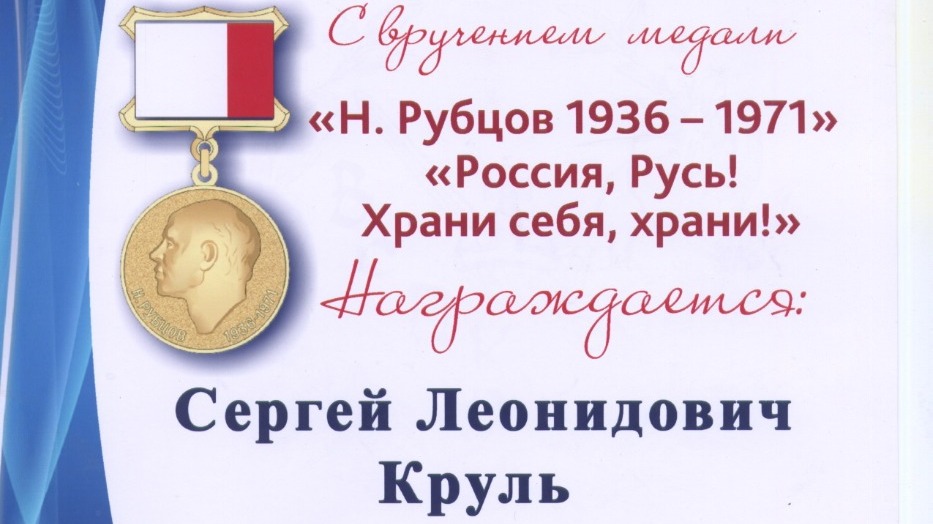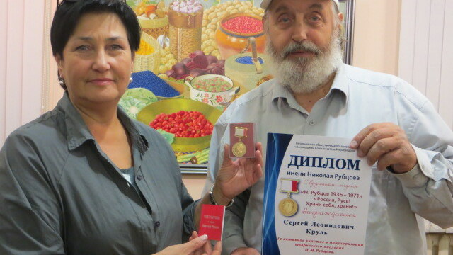 УФА, 20 сен 2018. /ИА «Башинформ», Алим Фаизов/. Известный уфимский бард и писатель Сергей Круль вернулся из Вологды, где принял участие в XXI открытом фестивале поэзии и музыки «Рубцовская осень». На фестивале ему были вручены диплом имени Николая Рубцова и памятная медаль «за активное участие в популяризации творческого наследия Н.М. Рубцова». Награды уфимскому барду вручила бессменный художественный руководитель фестиваля «Рубцовская осень» Ирина Цветкова.