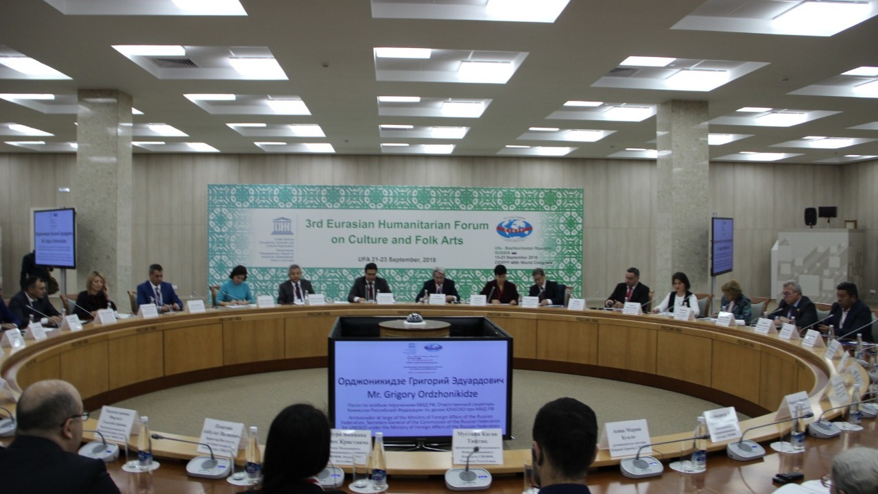 УФА, 22 сен 2018. /ИА «Башинформ», Ксения Калинина/. В Уфе, в большом зале Конгресс-холла, 22 сентября начал работу III Евразийский международный гуманитарный форум по вопросам культуры и народного творчества под эгидой Российской комиссии по делам ЮНЕСКО. Форум проходит в рамках мероприятий 48-го Всемирного конгресса и Генеральной Ассамблеи СИОФФ (Международного Совета организаций фольклорных фестивалей и традиционных искусств).