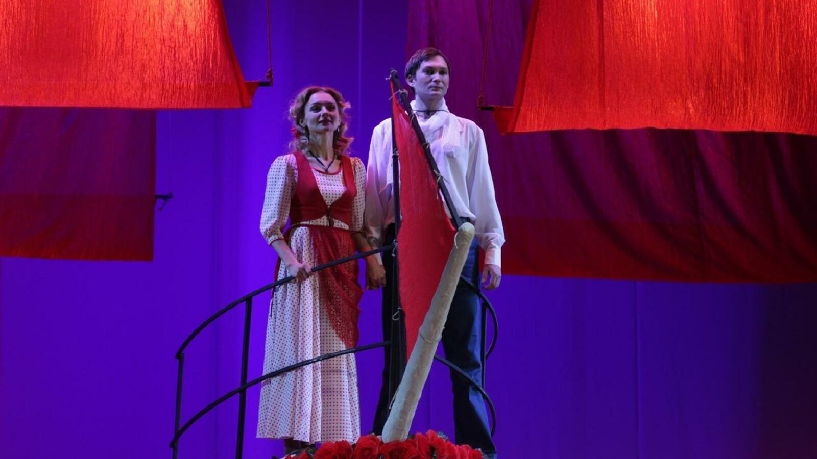 Романтическую фантазию по знаменитой повести-феерии Александра Грина поставил художественный руководитель театра Мусалим Кульбаев. Для постановки он воспользовался инсценировкой режиссера Московского губернского театра Аллы Решетниковой. В целом следуя тексту литературного первоисточника, автор сценической версии насыщает спектакль приемом «театр в театре».