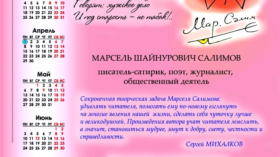 В конце книги опубликованы биографические сведения об авторе и «размышлизмы» из блокнота юмориста, где есть и такие слова: «К юмору отношусь серьезно, заранее зная, что не смеется тот, кто смеется последним». Коллеги же Марселя Салимова и его добрые читатели смеются вместе с любимым автором, тем более что сегодня у него день рождения, можно сказать, серьезный юбилей, 70-летие.