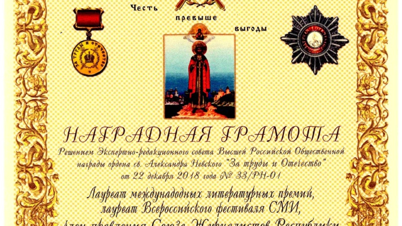 Решением Экспертно-редакционного совета лауреат международных и российских премий, главный редактор журнала «Хэнэк» («Вилы») в 1980–2010 годах и председатель Союза журналистов РБ в 1996–2006 годах писатель-сатирик Марсель Салимов удостоен этой высокой награды «за большую и плодотворную работу по исправлению недостатков нашей жизни, за его острое перо, которое заставляет быть лучше всех нас».Как отмечено в Статуте знака ордена св. Александра Невского «За труды и Отечество», Высшая российская общественная награда присуждается за коллективные и личные заслуги в процветании России. Ею награждены выдающиеся российские общественные деятели, политики, ученые и представители культуры, такие как Майя Плисецкая, Родион Щедрин, Александр Збруев, Марк Захаров, Артур Чилингаров.