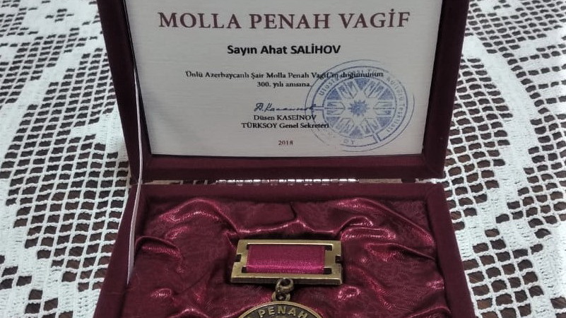 УФА, 1 фев 2019. /ИА «Башинформ», Лейла Аралбаева/.Башкирский ученый Ахат Салихов награжден Памятной медалью Моллы Панаха Вагифа. На днях Генеральный секретарь Международной организации тюркской культуры Дюсен Касеинов вручил награду для передачи отцу его дочери Асие Салиховой - ведущей телерадиостудии «Тамыр», в настоящее время обучающейся в турецком вузе.