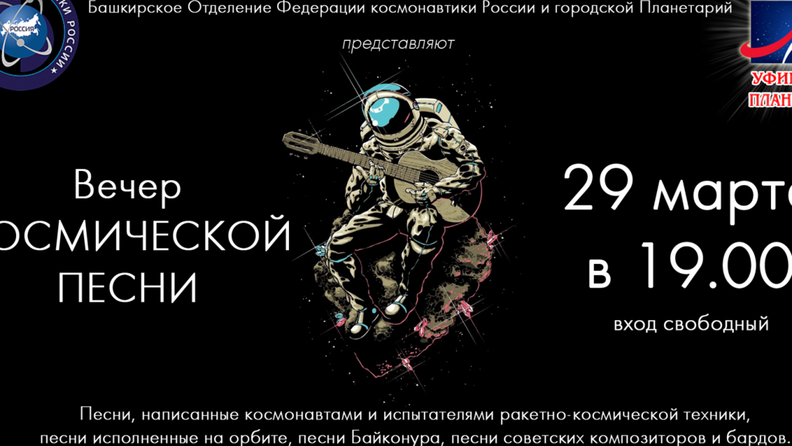 УФА, 26 мар 2019. /ИА «Башинформ»/. В преддверии Дня космонавтики, Башкирское отделение Федерации космонавтики России и Уфимский городской планетарий организуют вечер космической песни. Он будет посвящен 55-летию создания Уфимского планетария. Вечер состоится в пятницу, 29 марта. На нем прозвучат песни, написанные советскими композиторами и бардами, космонавтами и испытателями ракетно-космической техники, исполненные на орбите, песни Байконура, старые и новые, в живом исполнении и в записи.