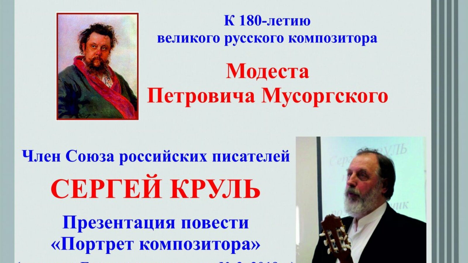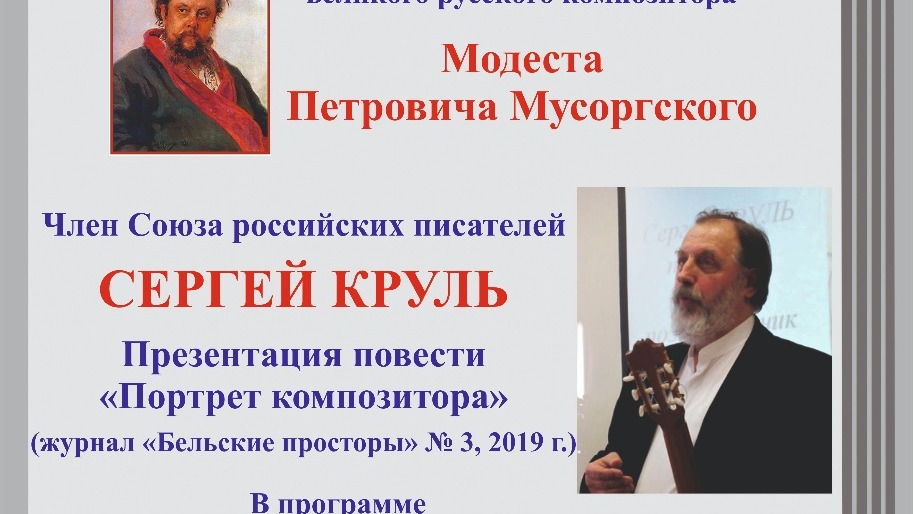УФА, 28 мар 2019. /ИА «Башинформ»/. Сегодня, 28 марта, в литературной гостиной Национальной библиотеки им. А.-З. Валиди Республики Башкортостан состоится презентация повести уфимского писателя Сергея Круля «Портрет композитора», посвященной 180-летию со дня рождения великого русского композитора Модеста Петровича Мусоргского. Повесть была опубликована в третьем номере журнала «Бельские просторы» за этот год.