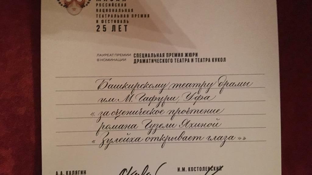Башкирский академический театр драмы имени Мажита Гафури удостоен Специальной премии жюри драматического театра и театра кукол «За сценическое прочтение романа Гузели Яхиной «Зулейха открывает глаза». Диплом лауреата подписан председателем Союза театральных деятелей России Александром Калягиным и президентом фестиваля «Золотая маска» Игорем Костолевским.