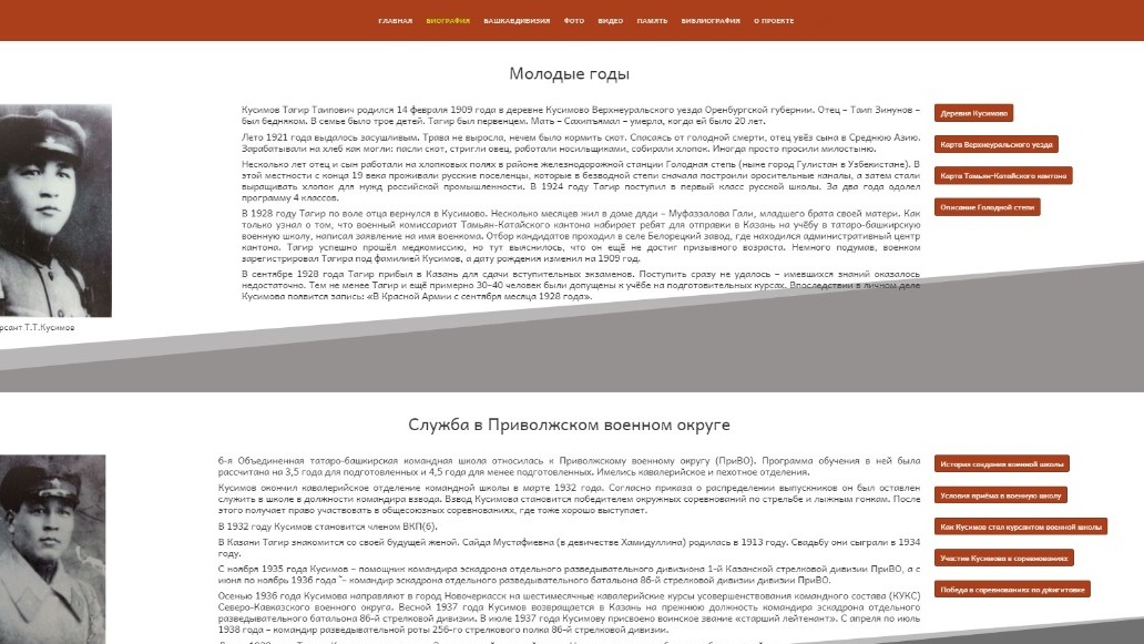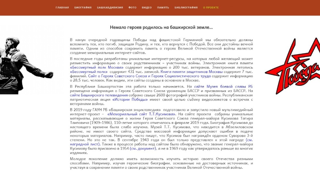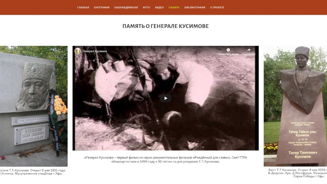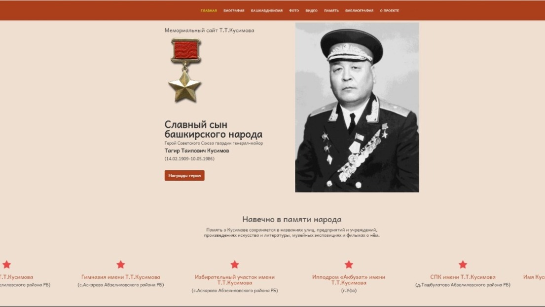 «На современном этапе подрастающее поколение активно познает мир, в том числе историю, через интернет. Поэтому мы подготовили «Мемориальный сайт Т.Т. Кусимова». Это первый мемориальный сайт, созданный энциклопедистами республики, - прокомментировали в «Башкирской энциклопедии». - В дальнейшем намереваемся создавать аналогичные интернет-сайты, посвященные не только военным, но и государственным и политическим деятелям, ученым, поэтам, художникам и другим известным уроженцам Республики Башкортостан».