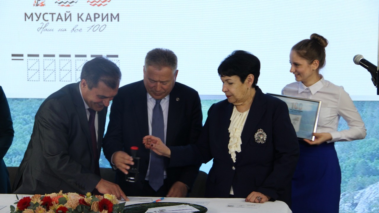 «Приветствую вас всех в очень важном для нашей семьи месте - Московском центральном Доме литераторов. Сегодня с нами наши дорогие близкие друзья. Появилась замечательная марка, которая станет еще одним важным этапом в праздновании 100-летия Мустая», - отметил Тимербулат Каримов и поблагодарил всех, кто поддержал идею о выпуске юбилейной марки.